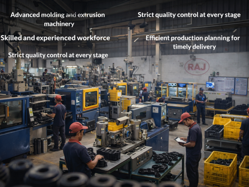 With strong technical expertise and deep knowledge of materials, processes, and applications, Raj Industries has grown into a trusted and recognized name in the rubber and plastic manufacturing sector. Our consistent focus on quality, precision, and customer satisfaction has enabled us to build long-term relationships with clients across India.